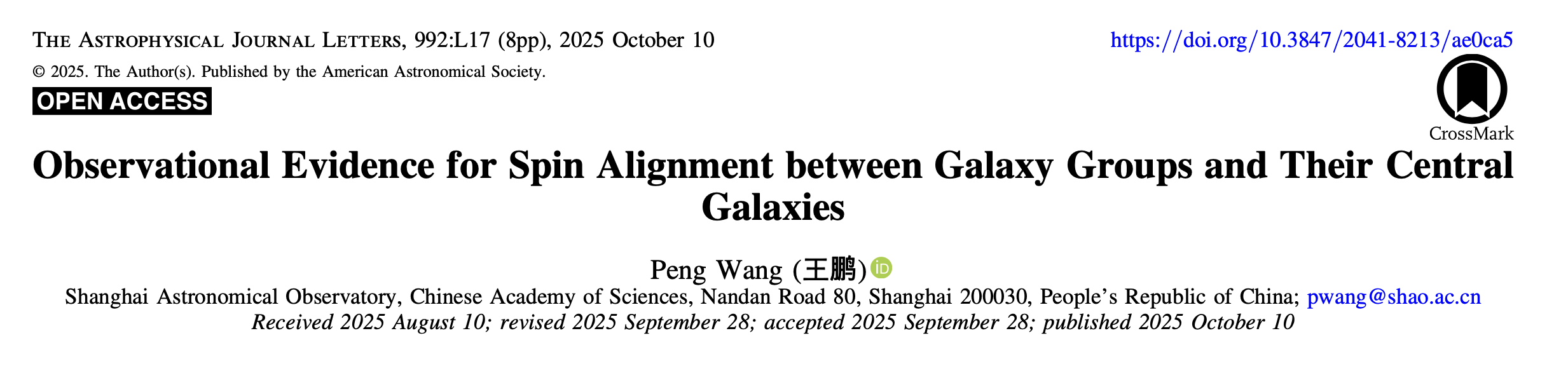 The results, titled “Observational Evidence for Spin Alignment between Galaxy Groups and Their Central Galaxies,” have been published in The Astrophysical Journal Letters. Dr. Wang is the sole author of the paper (see the screenshot of the article’s first page). By focusing on “spin” (angular momentum)—a direct dynamical quantity—the research highlights the crucial role of galaxy groups as an intermediate-scale “bridge” in the hierarchical transfer of angular momentum from large-scale cosmic structures (cosmic web/filaments) down to galaxies.