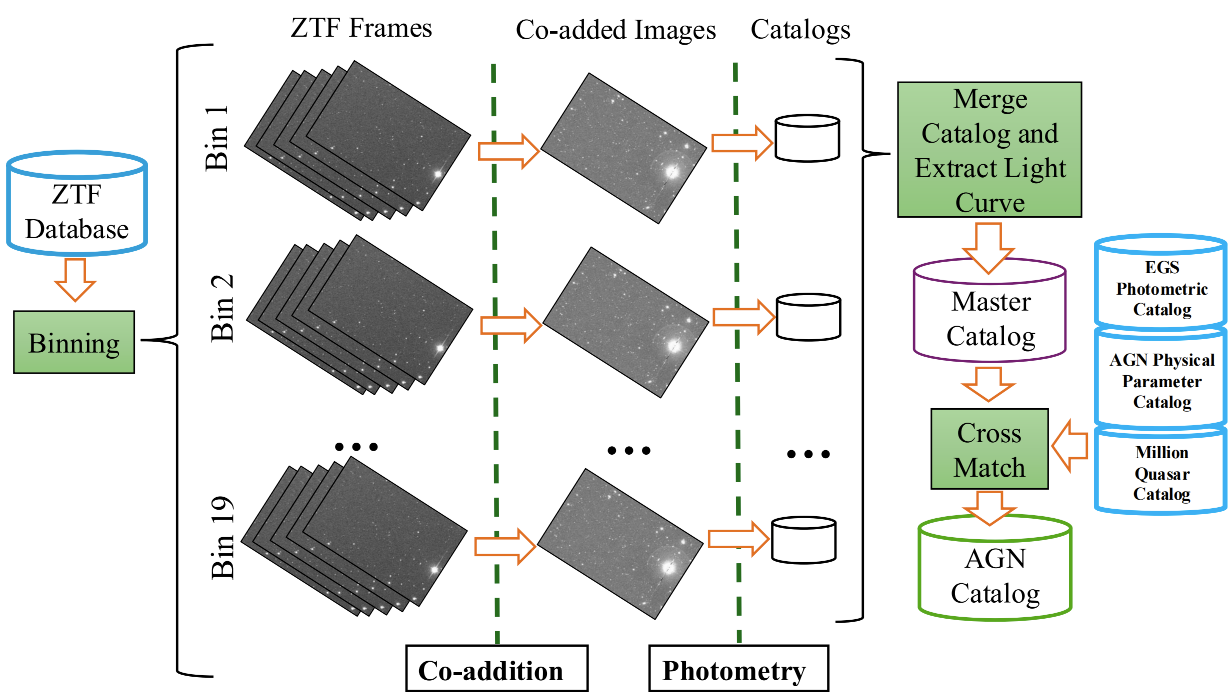 To overcome these observational challenge, the research team proposed an innovative forward-modeling data-processing strategy. Rather than post-processing existing light curves, the approach begins with the raw imaging data: single-epoch exposures are binned and stacked following the temporal sequence of observations (Figure 1). This procedure effectively integrates multiple short exposures, improving the detection limit by approximately 2.0–2.5 magnitudes. While sacrificing short-timescale variability, the method robustly preserves long-term variability on month-to-year scales, making it particularly suitable for AGN variability study.