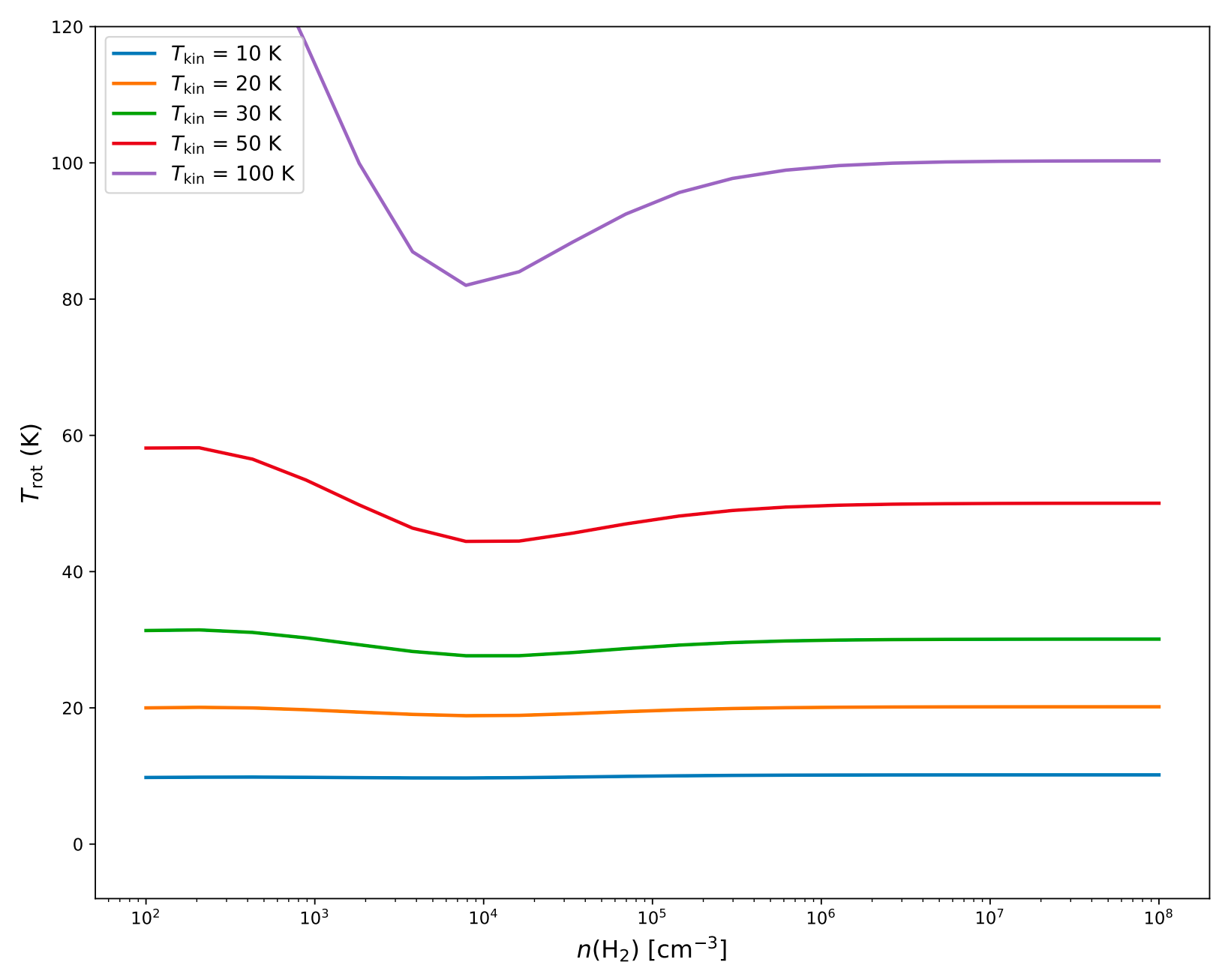 Figure 1: Statistical equilibrium calculation results for CH₃CCH. At densities above 10⁴ cm⁻³, the rotation temperature derived from CH₃CCH is essentially consistent with the gas temperature.