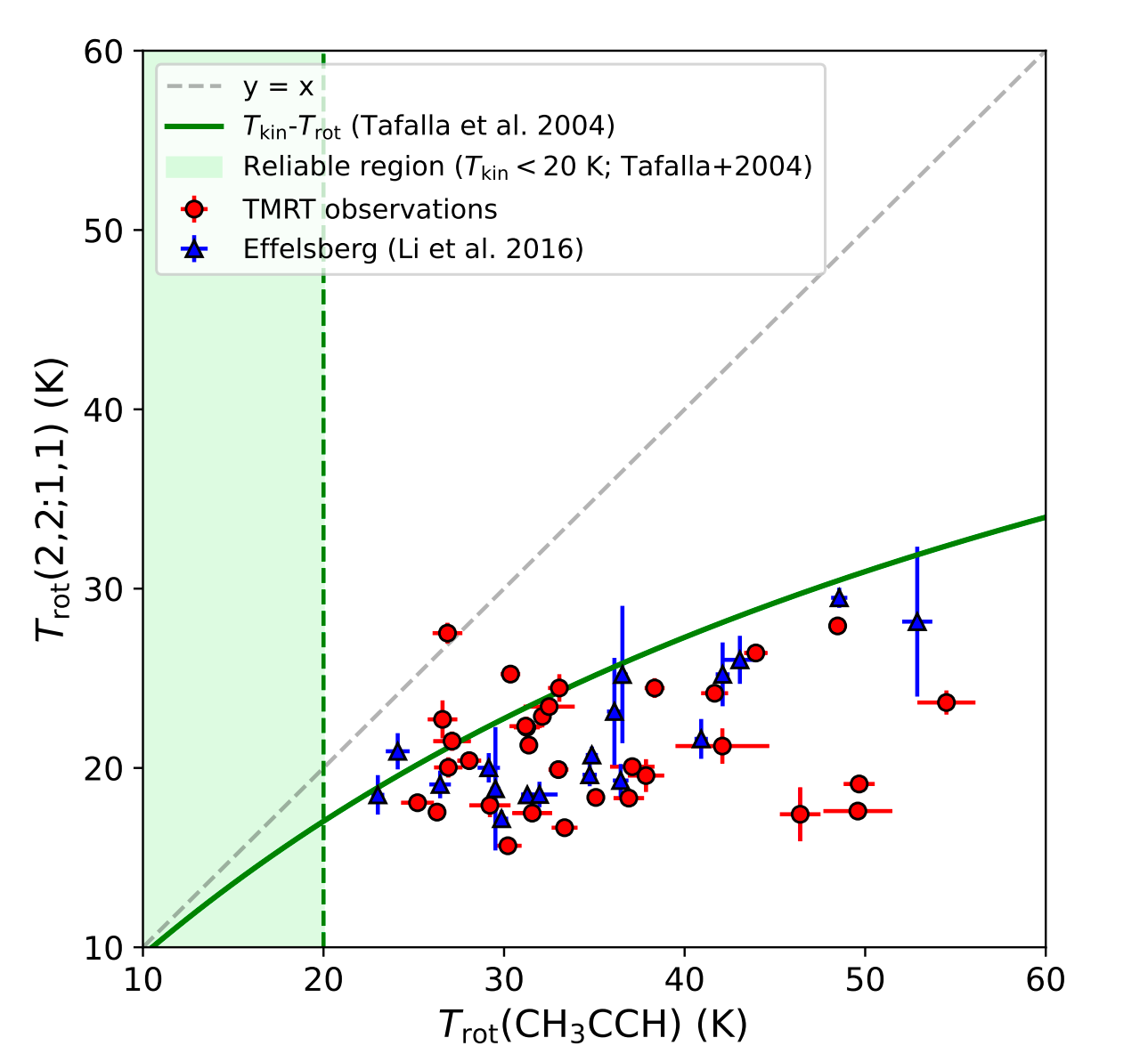 CH₃CCH, observed in the millimeter waveband, is considered an ideal temperature probe for warm molecular gas. Statistical equilibrium analysis (Figure 1) indicates that under typical warm gas densities (n > 10⁴ cm⁻³), the rotation temperature of CH₃CCH effectively reflects the gas's kinetic temperature. Furthermore, millimeter-wave observations allow for the simultaneous acquisition of multiple CH₃CCH lines, reducing systematic errors from instrument calibration or changing conditions. Leveraging high-quality NH₃ reference data from TMRT, the team systematically analyzed the reliability of different probes in warm environments.