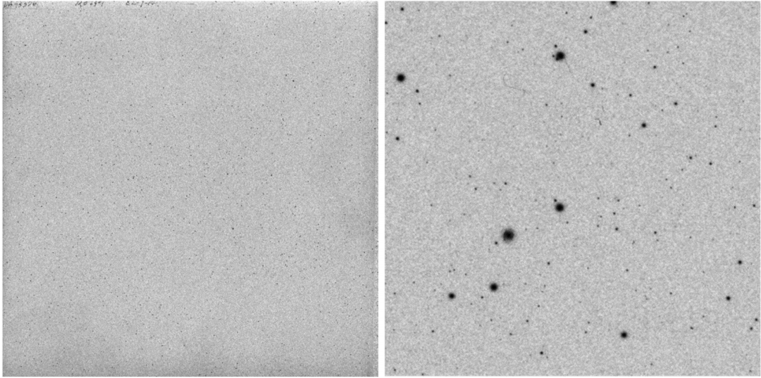 Figure 2. Digitized image of astronomical plate BJ8204DA3376001. Left: full plate with angular size 8.1。 × 8.1。. Right: a magnification of the plate’s central area with angular size 25’×25’.