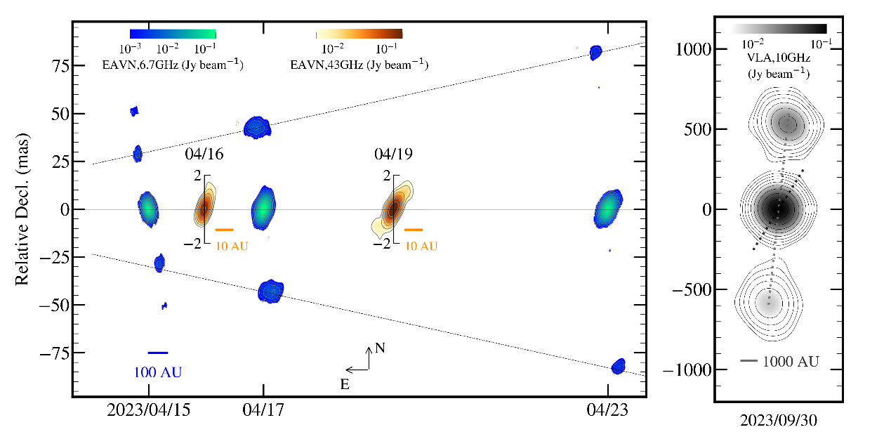A microquasar is a binary system consisting of a stellar-mass black hole or neutron star and a normal companion star. GRS 1915+105 is one of the most famous black-hole microquasars. Since its discovery in 1992, its jet direction has retained stable at a position angle of around 147°. During a radio outburst of this source in April 2023, the researchers resolved two-sided discrete ejecta from its 6.7 GHz images obtained with the EAVN, while detecting the central continuous jet in 43 GHz images. The results show that the continuous jet remains consistent with the long-term direction (~147°), whereas the discrete ejecta appear at a position angle of approximately 188° — a deviation of more than 40° from the continuous jet. A similar deviation in position angle was observed during a consecutive outburst in late September 2023.