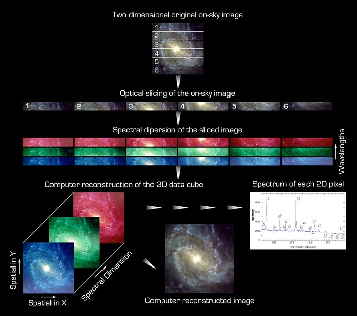 Figure 2. Principle of integrating field of spectroscopy. After the 2D image of a galaxy is divided into fields of view, spectra are generated for each field of unit. All generated spectra are arranged into a data cube, which contains the entire two-dimensional field of view and the third dimension extracted from the spectrometer. The spectrometer divides the light into different colors or wavelengths. Astronomers can use the rich information of integrated field of spectroscopy to measure, for example, the motion of gas in distant galaxies. Credit: ESO