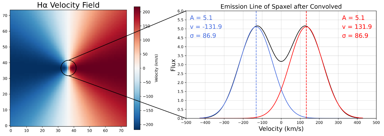 Under an ideal telescope with infinite spatial resolution, the gas motion at every position on a rotating disk galaxy can be resolved. So, the observed spectrum will be: a blue-shifted emission-line peak seen on the blue-shifted side of the disk, and a red-shifted emission-line peak seen on the red-shifted side. At any position, the gas has only one dominant velocity direction, thus contributing only to one peak (as shown in Figure 3). However, all telescopes in reality have a spatial resolution limit. This means that we cannot distinguish the tiny details on the disk (PSF effect). Light from a large area on the disk will be mixed together by the telescope and gathered into the same pixel or spectral element. The scale of this mixed region is much larger than that of a local area with a single velocity on the disk. In an area blurred by PSF, if there are enough gas with significant velocity differences (i.e., high-speed blue shift and high-speed red shift) simultaneously, this area will produce bright double-peaked narrow emission lines.