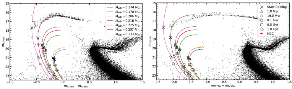 Figure 1 Color-Mass Diagram of the whie-dwarf companion of M2C. Left panel: A combination of the F275W and F336W filters. Right panel: A combination of F275W and F438W filters. The red plus represents the measurement of the white dwarf companion, and the error bar corresponds to 1-sigma confidence interval. The colored curves are tracks of the white dwarf with different masses. Different cooling ages are represented by different symbols.