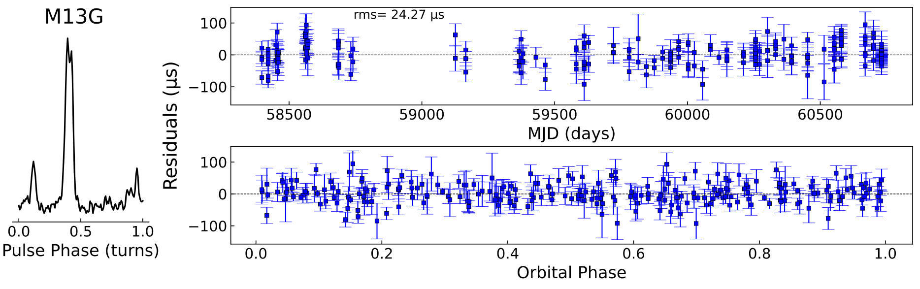 The research team utilized an improved FFT+jerk algorithm to search 84 timing observations of the GC M13 conducted by FAST from 2018 to 2025, leading to the discovery of two faint binary pulsars, M13G and M13H (PSR J1641+3627G/H). Both pulsars were detected during their scintillation-enhanced states, and exhibited relatively lower detection rates compared to other known pulsars in M13.The team successfully derived coherenttiming solution for M13G, confirming it as a typical black widow system with a spin period of 4.32 ms, an orbital period of 0.12 days, and a companion mass <0.01 solar masses ( see Figure 3). This system has the largest projected angular distance from the center of M13 among all known pulsars in this GC, located 1.8 arcminutes from the center. Its presence in a circular orbit supports the theoretical inverse relationship between orbital eccentricity and distance from the cluster center. M13H has a spin period of 11.21 ms. Due to its faint signal, it was detected in only two out of the 84 observations, and a coherent phase timing model has not yet been obtained.