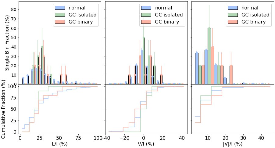 Figure4, histograms and cumulative distribution of polarization ratios for different pulsar categories. Normal pulsar data are from Wang et al. (2023).
