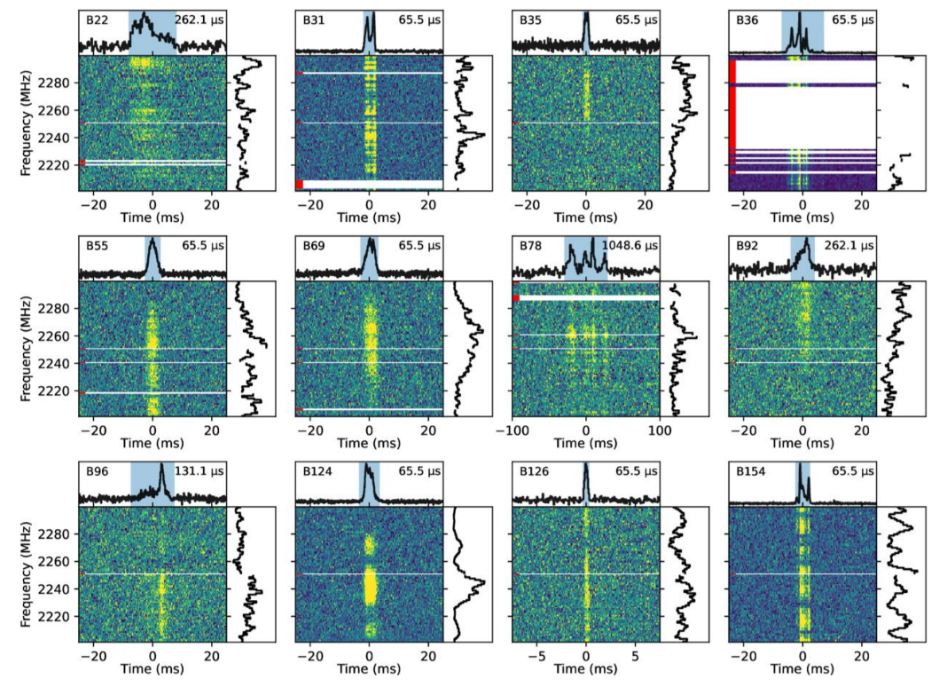 Figure 1: Representative bursts of FRB 20240114A detected by TMRT. In each subplot the dynamic spectrum is shown in the centre, with the time‑domain profile above and the frequency‑domain profile on the right.