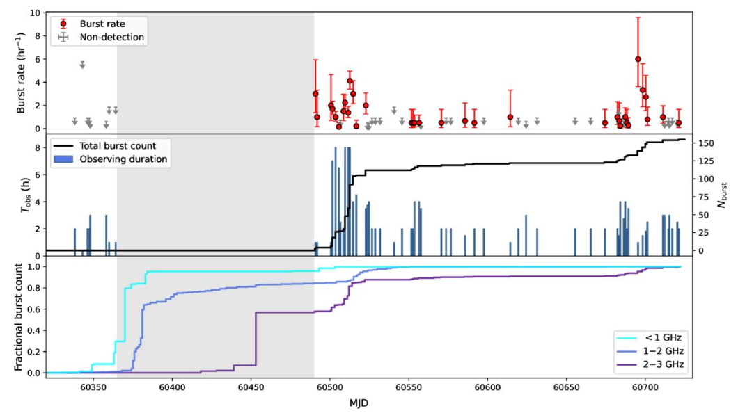 The study also found that the “preferred frequency” of FRB 20240114A bursts is not constant. In January–February 2024, its activity decreases as the observing frequency increases; however, in May–July 2024 a pronounced activity peak appears around 2–3 GHz, indicating that the frequency‑dependence of its activity evolves over time. This phenomenon may reflect evolution of the burst’s surrounding environment, such as synchrotron self‑absorption suppressing low‑frequency bursts, or extreme scattering events during signal propagation that modulate the burst rate observed at particular frequencies, among other possibilities.