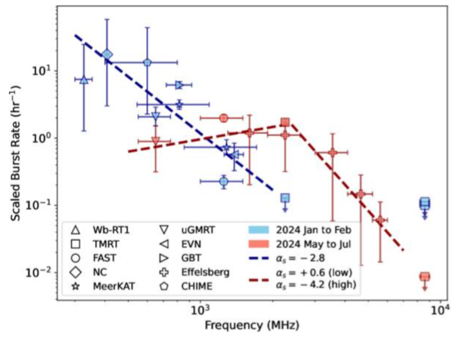 Figure 3: Burst rate of FRB 20240114A as a function of observing frequency during 2024 January‑February (blue) and May‑July (red). All observations from different telescopes have been scaled to TMRT’s detection threshold, showing a clear change in the frequency‑dependence of the source’s burst rate between the two periods.