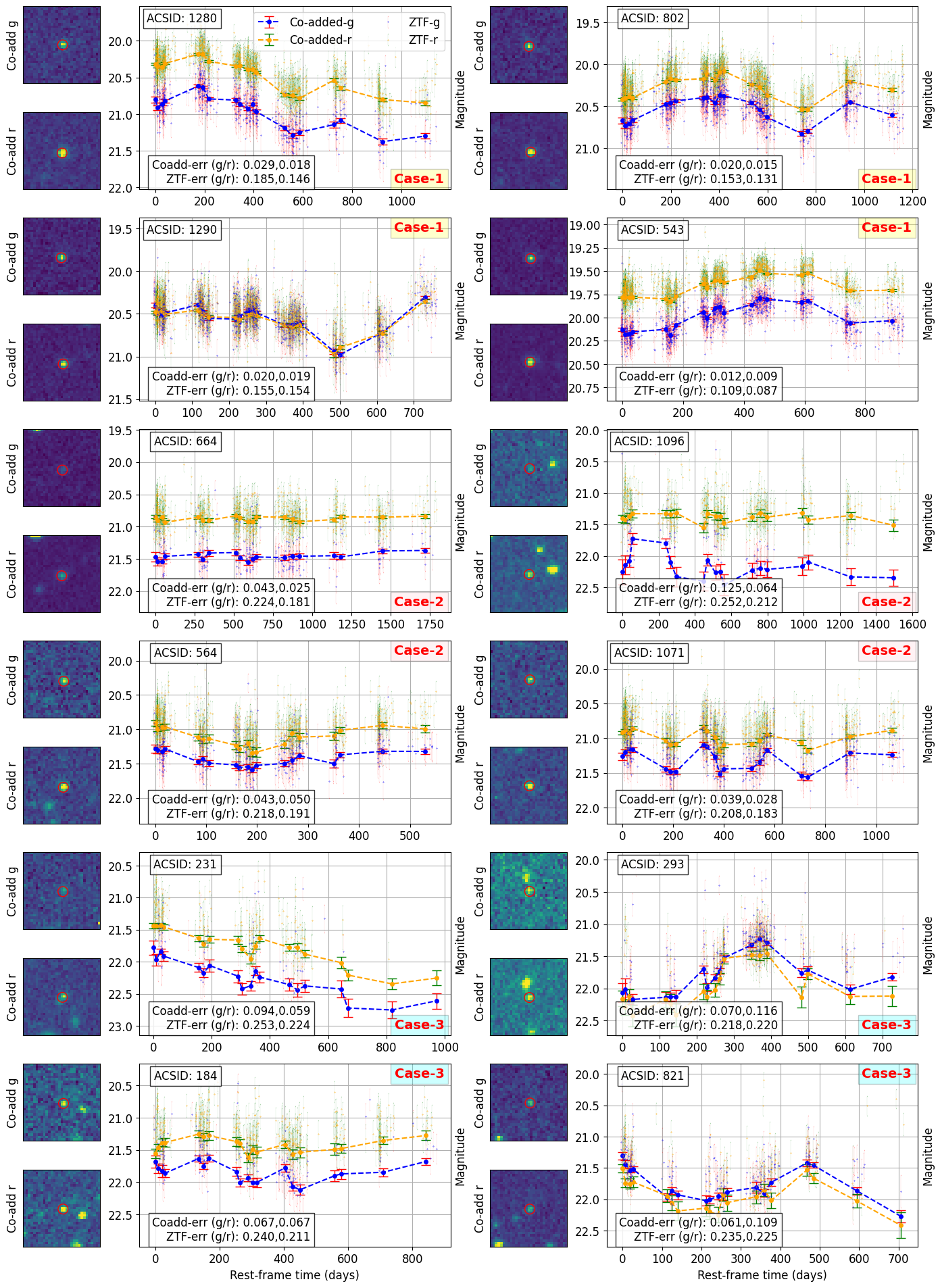 A joint research team from the Early Universe and High-Redshift Galaxy Group at the Shanghai Astronomical Observatory (SHAO), Chinese Academy of Sciences, and the Optical–Infrared Observational Research Group at Sun Yat-sen University (SYSU), has recently made significant progress in improving the quality of long-term light curves for Active Galactic Nuclei (AGNs). By stacking multi-epoch images from the Zwicky Transient Facility (ZTF), the team has effectively enhanced the signal-to-noise ratio (SNR) of the observational data, enabling high-quality reconstruction of AGN light curves that were previously inaccessible due to their intrinsic faintness. This advancement reveals long-term variability and color-evolution characteristics with unprecedented clarity, providing critical observational constraints for probing the physical mechanisms and accretion dynamics of AGN central engines.
