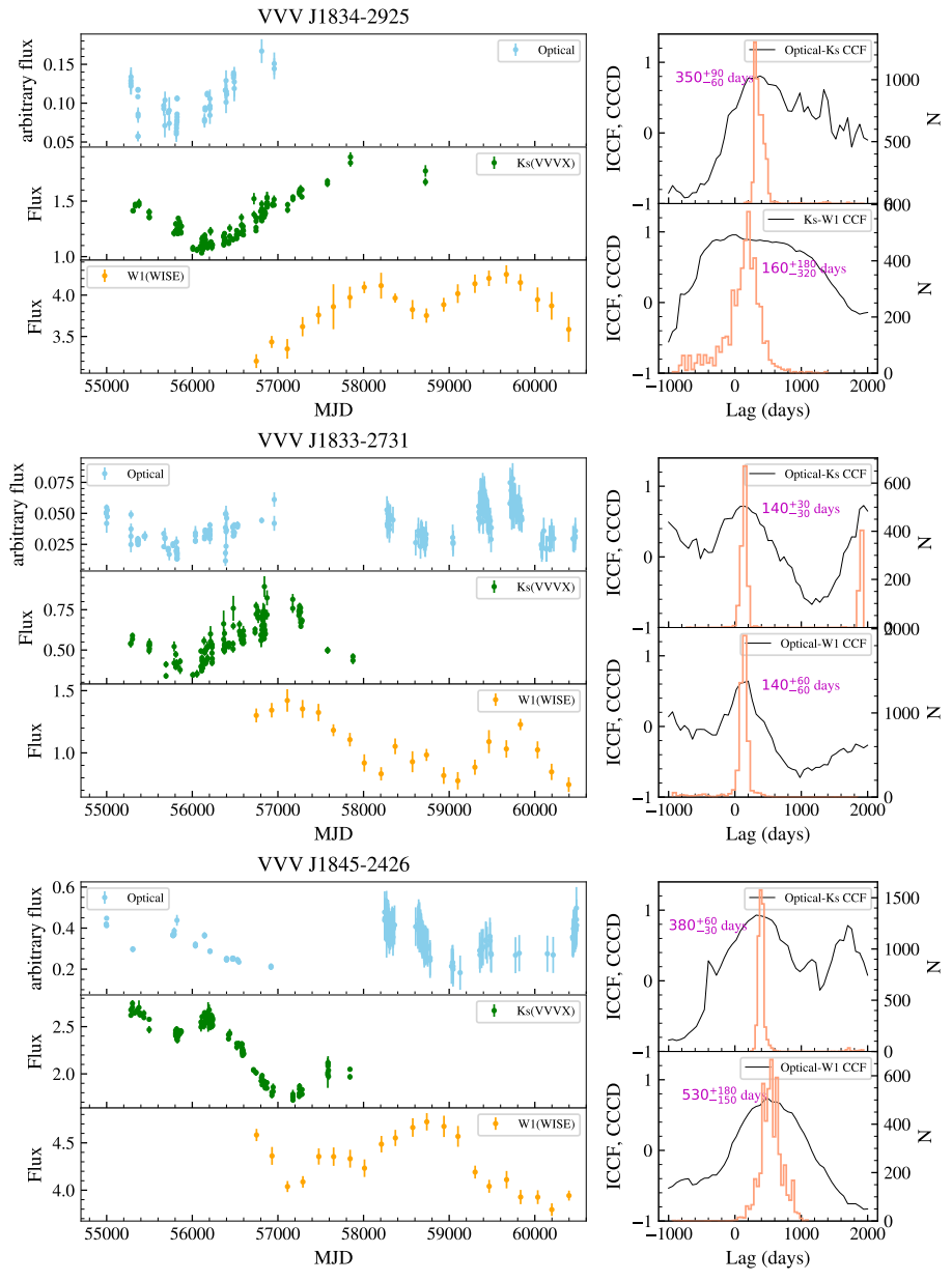 Figure 1. Light curves (left) and ICCF results (right) of the target sources VVV J1834-2925 (top), VVV J1833-2731 (middle), and VVV J1845-2426 (bottom). The CCF analysis results in the top-right corner correspond to optical-NIR and NIR-MIR correlations, respectively. All other CCFs represent optical-NIR and optical-MIR correlations. In the right panels, the orange lines indicate the CCCD, and the CCF results are shown in black.