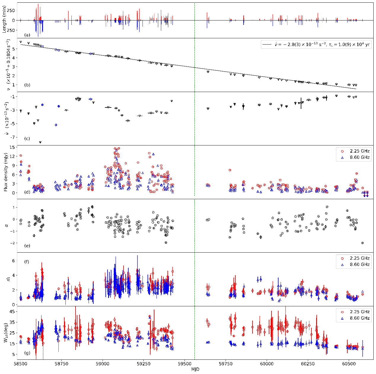Figure 1: Temporal evolution of the rotation and radiation parameters of XTE J1810−197: (a) duration of dual-frequency observations; (b) rotation frequency; (c) first derivative of rotation frequency; (d) dual-frequency flux density; (e) spectral index; (f) phase modulation index of the intermediate component; (g) width of the intermediate component at 10% of peak intensity.