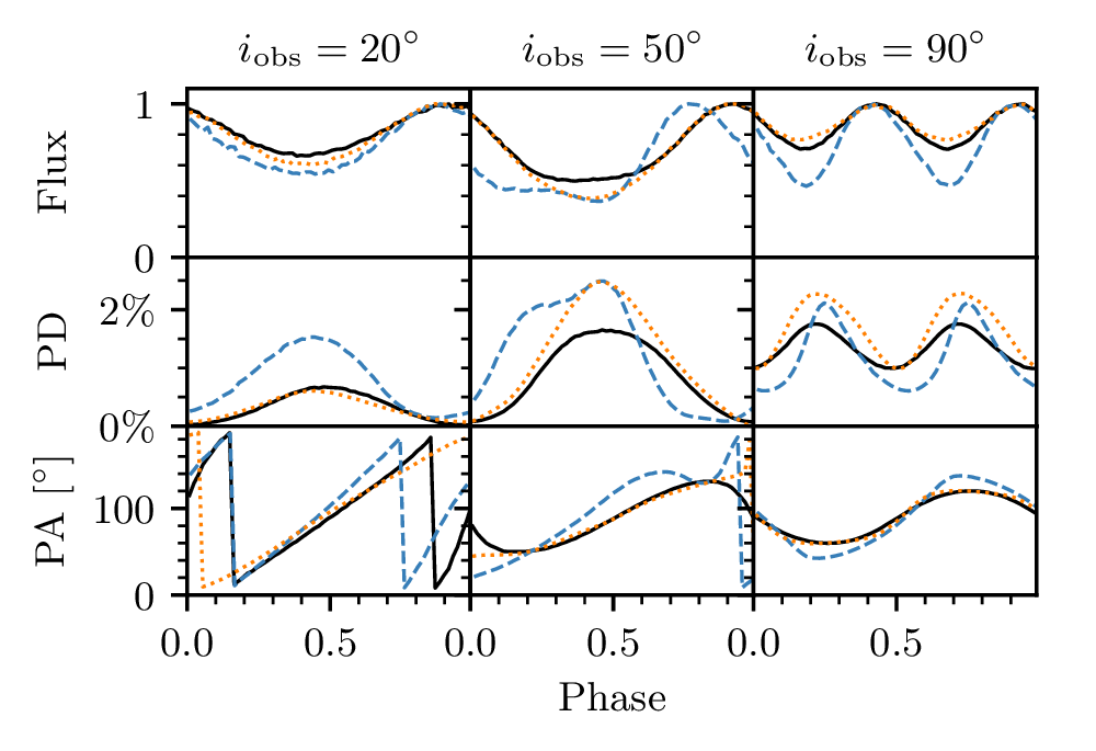 Figure: Comparison of pulse profiles (top), polarization degree (middle), and polarization angle (bottom) calculated by MONK-NS for hot spots with different geometric shapes (Black, orange and blue dashed lines represent the results for circular, crescent, and eclipse hot spots, respectively). These provide benchmark standards for polarization radiation models. Credit: Zhang & Yu 2026.