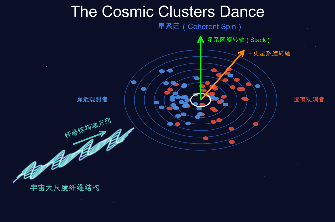 Recently, a research team led by Prof. Peng Wang at the Shanghai Astronomical Observatory (SHAO), Chinese Academy of Sciences (CAS), achieved significant progress in the field of galaxy cluster angular momentum. Utilizing large-sample spectroscopic data from the Sloan Digital Sky Survey (SDSS), the team systematically revealed for the first time that galaxy clusters exhibit significant spin coherence on the celestial projection plane. This achievement, titled "The Cosmic Dance: Observational Detection of Coherent Spin in Galaxy Clusters," was published in 《The Astrophysical Journal Letters》, providing new observational clues for a deeper understanding of dynamical properties at the galaxy cluster scale.