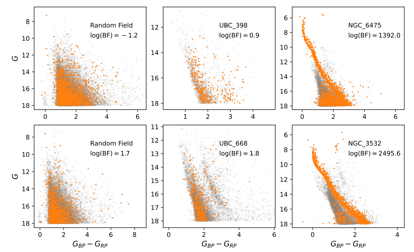 To address this problem, the research team utilized the Bayesian framework of the MiMO model to transform "cluster candidate validation" into a rigorous statistical model comparison problem: comparing whether the observational data better supports a "Single Stellar Population (SSP, i.e., cluster) + Field Star" mixture model or a "Pure Field Star" model. The ratio of the evidence for these two models, known as the Bayes Factor (BF), directly quantifies the strength of statistical support for the cluster's existence.