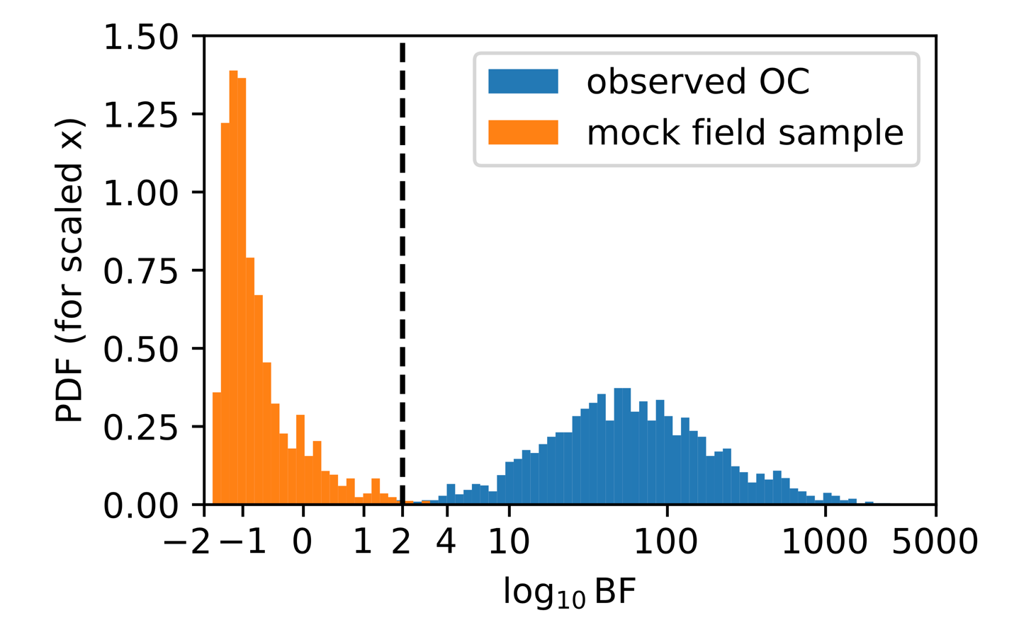 Fig 3. The distribution of Bayes Factors effectively separates real signals from noise. The blue histogram represents confirmed Open Clusters, while the orange represents mock random field samples. The vertical dashed line marks the threshold at log_{10}(BF) = 2. This clear separation demonstrates that the metric robustly distinguishes genuine physical systems from random background fluctuation.